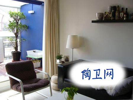 客廳的皮質(zhì)沙發(fā)。沙發(fā)黑色的,窗簾米白色的,再加上開放式的小陽臺,舒適、簡約。
