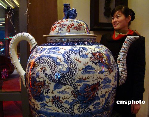 2009年1月2日,一名女士在觀賞景德鎮(zhèn)陶瓷巨壺。近日,一把可供300人同飲的景德鎮(zhèn)陶瓷巨壺在蘇州一家陶瓷商店亮相。據(jù)了解,這把陶瓷巨壺高約120厘米,壺身直徑約85厘米。
