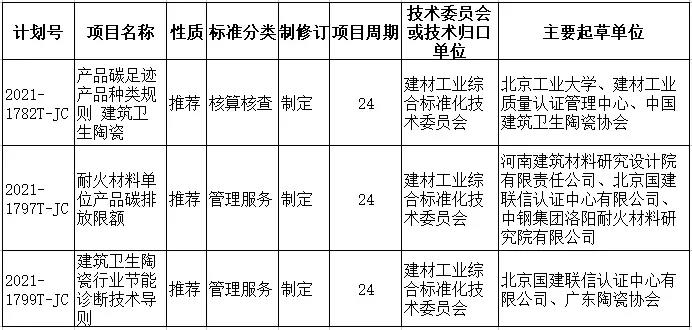 為發(fā)揮標(biāo)準(zhǔn)在推進(jìn)工業(yè)領(lǐng)域碳達(dá)峰碳中和工作的引領(lǐng)和規(guī)范作用,工業(yè)和信息化部于2021年12月22日下達(dá)了工業(yè)領(lǐng)域首批110項(xiàng)碳達(dá)峰碳中和專項(xiàng)行業(yè)標(biāo)準(zhǔn)制修訂項(xiàng)目計(jì)劃,其中,陶瓷行業(yè)共有3項(xiàng)(見附表)。本批行業(yè)碳達(dá)峰碳中和專項(xiàng)行業(yè)標(biāo)準(zhǔn)重點(diǎn)圍繞碳核查核算、低碳技術(shù)與裝備、低碳產(chǎn)品與企業(yè)評(píng)價(jià)、監(jiān)測設(shè)備與方法、碳排放以及綠色低碳建材評(píng)價(jià)、資源綜合利用協(xié)同降碳等方面。