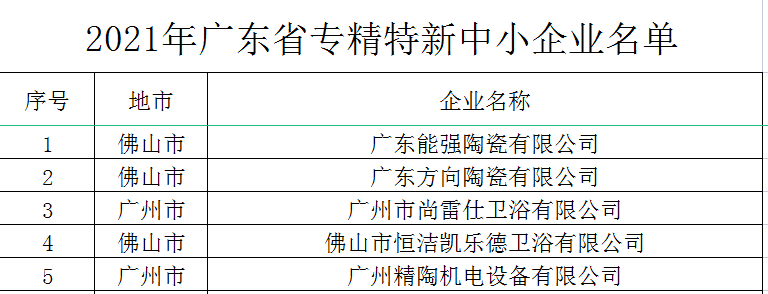 1月5日,廣東省工業(yè)和信息化廳公布2021年廣東省專精特新中小企業(yè)名單,1459家企業(yè)獲認定。其中,廣東能強陶瓷有限公司、廣東方向陶瓷有限公司、廣州市尚雷仕衛(wèi)浴有限公司、佛山市恒潔凱樂德衛(wèi)浴有限公司、廣州精陶機電設(shè)備有限公司等5家陶瓷衛(wèi)浴及相關(guān)企業(yè)上榜。