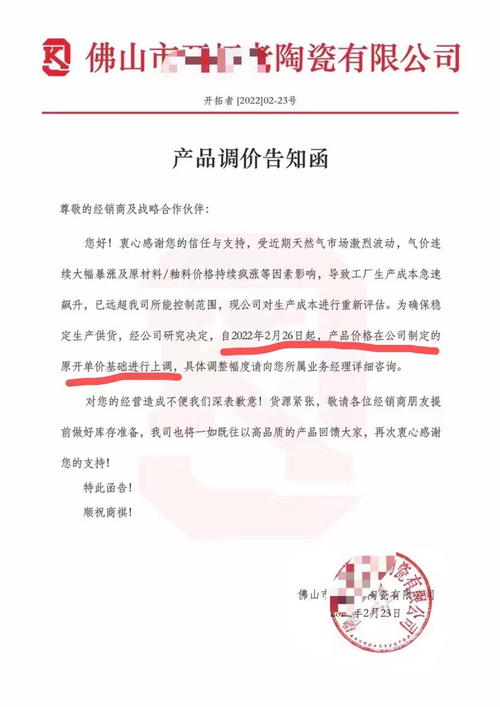 近日,廣東又一家陶企宣布產(chǎn)品調(diào)節(jié)告知函。該公司的函告內(nèi)容顯示,自2022年2月26日起,產(chǎn)品價(jià)格在公司制定的原開單價(jià)基礎(chǔ)上進(jìn)行上調(diào),具體調(diào)價(jià)服務(wù)向所屬業(yè)務(wù)經(jīng)理咨詢。