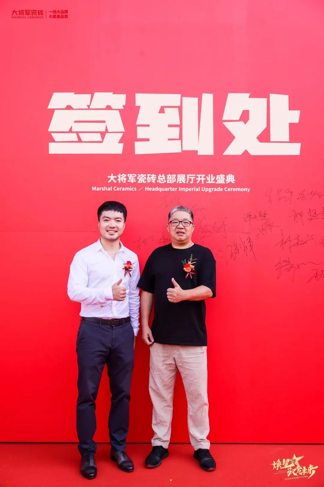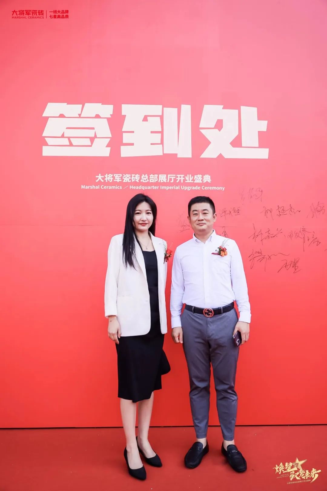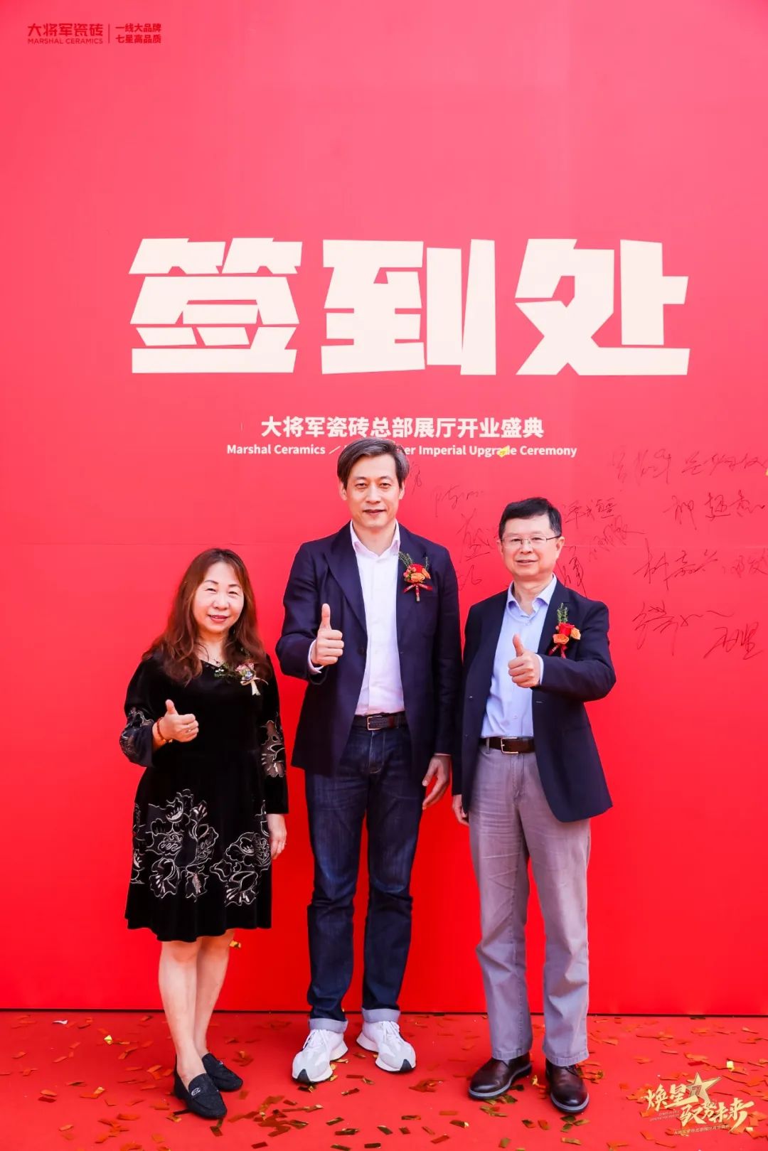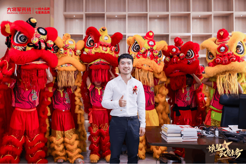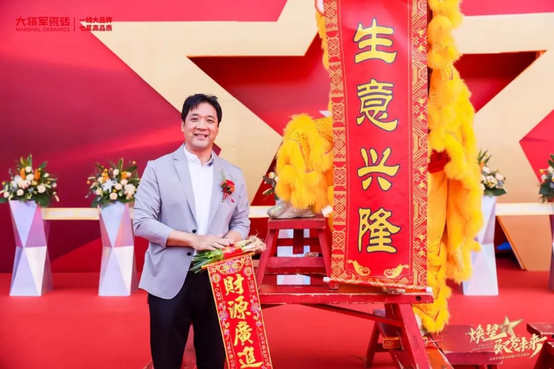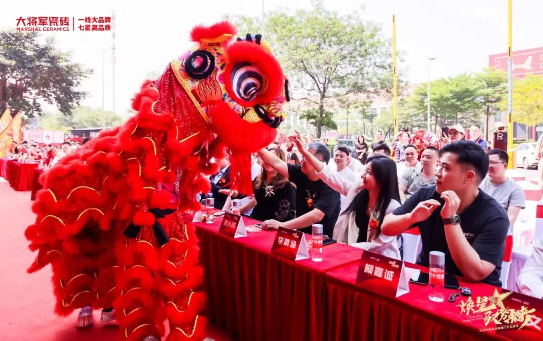 慶典當(dāng)天,鑼鼓喧天,醒獅獻(xiàn)瑞?;ɑ@簇?fù)?,歡聲笑語。現(xiàn)場布置紅紅火火,處處洋溢著歡樂喜慶的氛圍。領(lǐng)導(dǎo)、嘉賓和經(jīng)銷商客戶陸續(xù)進(jìn)場簽到,共同祝賀大將軍瓷磚展廳開業(yè)大吉、財(cái)源廣進(jìn)、宏圖大展!