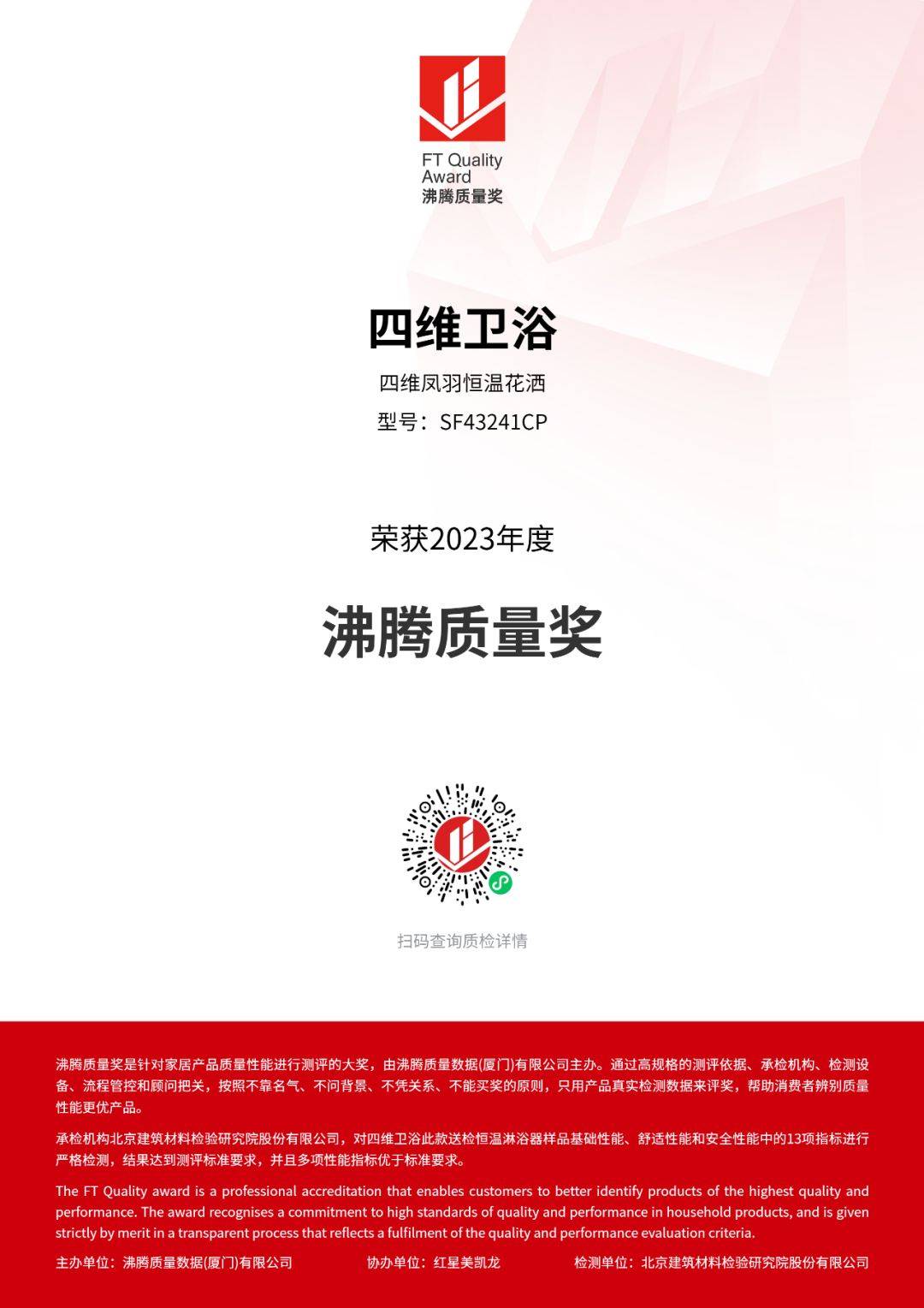 在2023沸騰質(zhì)量獎(jiǎng)測(cè)評(píng)中,四維衛(wèi)浴參評(píng)的四維鳳羽恒溫花灑SF43241CP,經(jīng)過承檢機(jī)構(gòu)北京建筑材料檢驗(yàn)研究院股份有限公司,對(duì)四維衛(wèi)浴此款送檢恒溫淋浴器樣品基礎(chǔ)性能、舒適性能和安全性能中的13項(xiàng)指標(biāo)進(jìn)行嚴(yán)格檢測(cè),結(jié)果達(dá)到測(cè)評(píng)標(biāo)準(zhǔn)要求,并且多項(xiàng)性能指標(biāo)優(yōu)于標(biāo)準(zhǔn)要求,獲得“沸騰質(zhì)量獎(jiǎng)”。