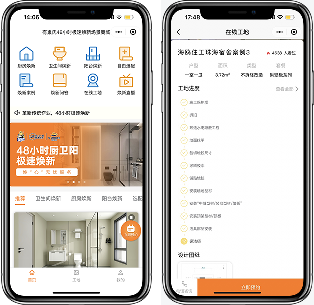 “48小時(shí)廚衛(wèi)陽極速煥新”小程序是家先生全新打造的官方廚衛(wèi)陽煥新服務(wù)體系。該體系集“廚房煥新”、“浴室煥新”和“陽臺(tái)煥新”、“自由選配”、“在線工地”等功能于一體,是一款煥新有保障、更快捷、個(gè)性化煥新需求的煥新服務(wù)體系。