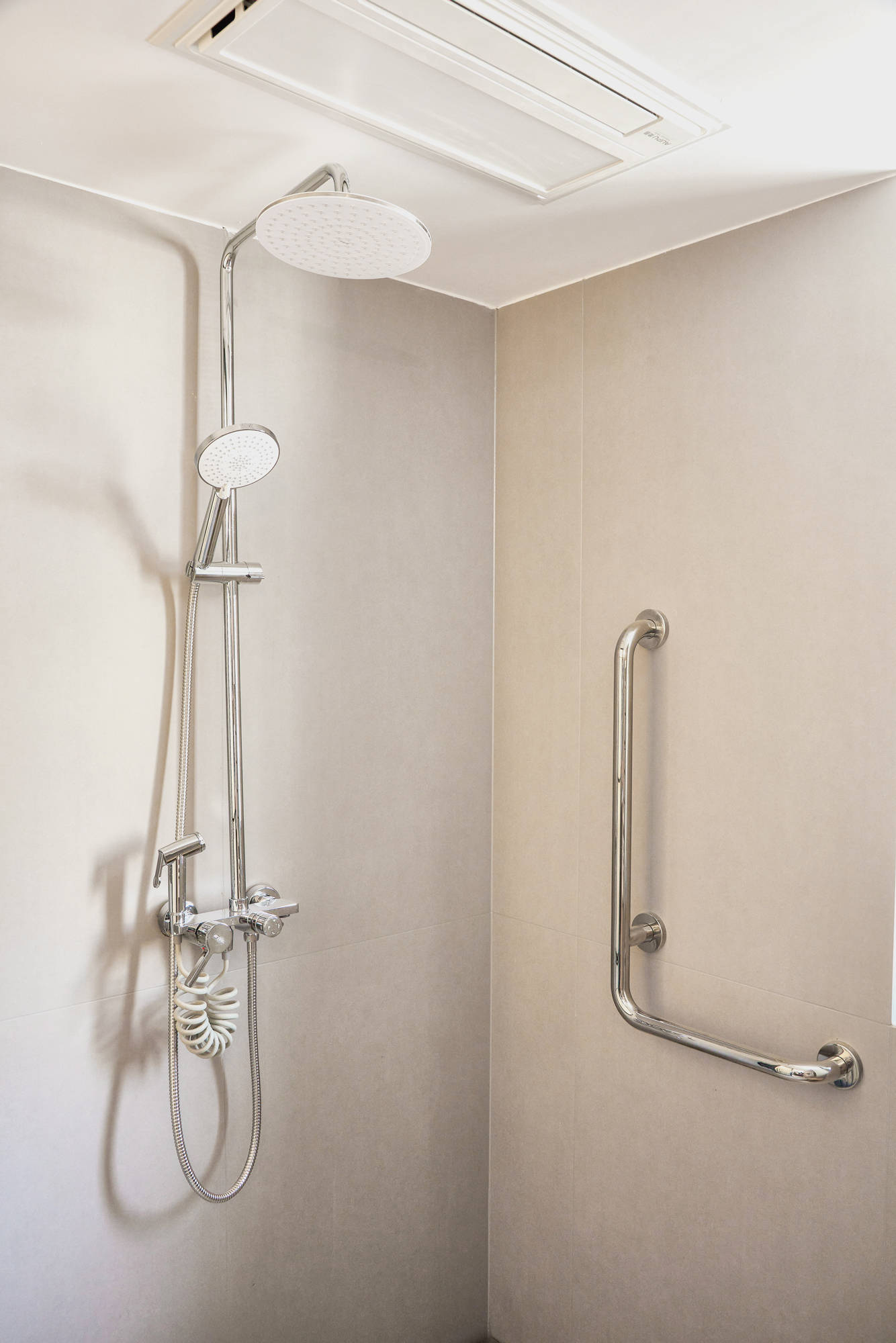 設(shè)計(jì)師對(duì)新房衛(wèi)生間重新布局,借用廚房的一小部分空間,將洗手臺(tái)嵌入墻體,合理劃分出衛(wèi)生間的洗漱區(qū),讓出足夠的空間給如廁區(qū)和淋浴區(qū),并選用鷹衛(wèi)浴智能坐便器、大頂噴花灑,貼心安裝了扶手,不僅有效做到干濕分離,帶來(lái)健康舒適的衛(wèi)浴體驗(yàn),最大化滿(mǎn)足了老年人的生活需求。