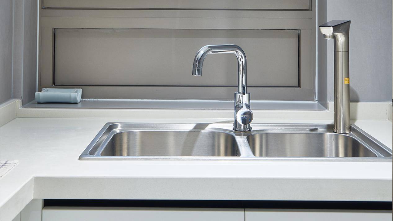 新房廚房寬敞明亮,設(shè)備齊全,搭配鷹衛(wèi)浴SUS304拉絲廚衛(wèi)雙盆KS-4011.2和92系列面盆龍頭EF-921011,暢享廚房樂(lè)趣。