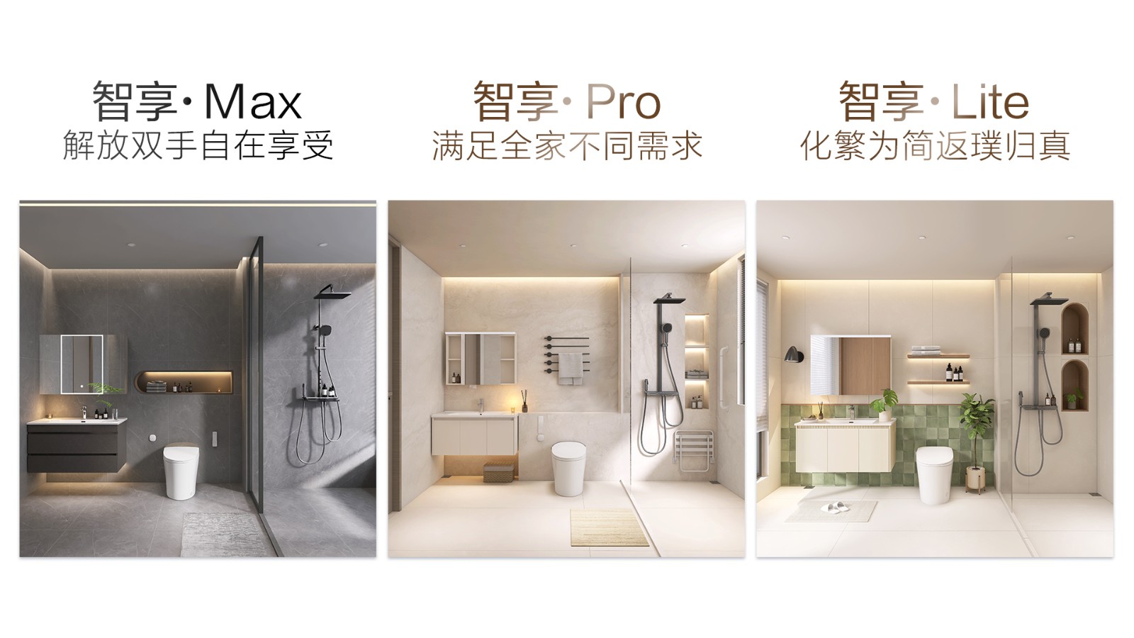 以套系化設(shè)計(jì)為核心,重磅推出三大「智」愈空間,以多樣產(chǎn)品組合匹配不同人群需求。套間內(nèi)包含行業(yè)爆款舒沐洗H5Pro智能馬桶、口碑爆款H35Pro的升級(jí)力作——全新H36Max智能馬桶、以及HQ606輕智能馬桶,三大單品按需選購(gòu),更搭配了高顏值美妝智能鏡柜與鋼琴鍵花灑,實(shí)現(xiàn)功能與美學(xué)的雙重升級(jí)。