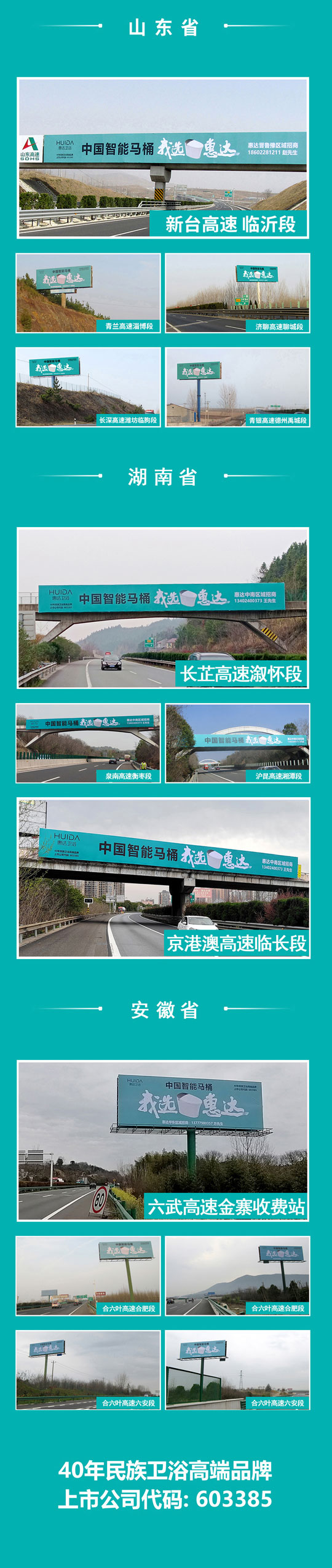 據(jù)了解,本次惠達(dá)衛(wèi)浴最新的高速公路廣告投放覆蓋了全國8大省區(qū),37條路段,上百塊廣告位同步亮相,遍及江蘇、貴州、湖南、四川、安徽、湖北、山東、遼寧等各省份。此外,本次投放地點選擇,以高車流量的主要交通樞紐及主干道為主。涵蓋跨線橋、單立柱、LED屏等重要媒體形式,廣告效果醒目且視覺沖擊力十足。