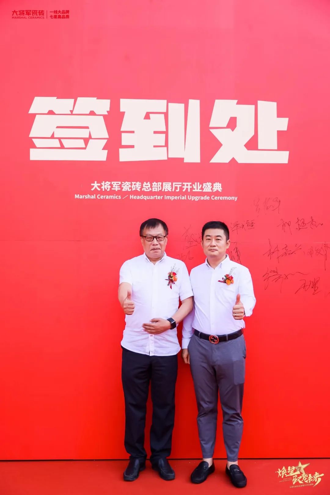 慶典當(dāng)天,鑼鼓喧天,醒獅獻(xiàn)瑞?;ɑ@簇?fù)?,歡聲笑語。現(xiàn)場布置紅紅火火,處處洋溢著歡樂喜慶的氛圍。領(lǐng)導(dǎo)、嘉賓和經(jīng)銷商客戶陸續(xù)進(jìn)場簽到,共同祝賀大將軍瓷磚展廳開業(yè)大吉、財(cái)源廣進(jìn)、宏圖大展!