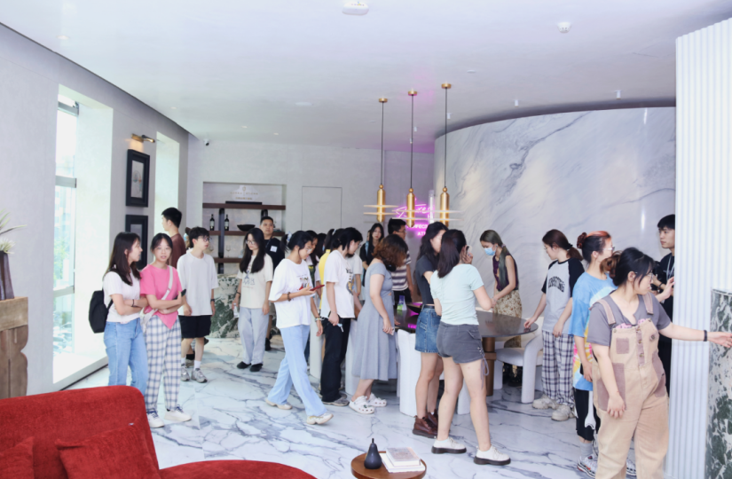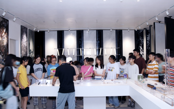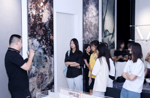 在歐若拉精工奢石高定館的參觀環(huán)節(jié)中,多位產(chǎn)品技術(shù)人員向廣美研學(xué)團(tuán)一行進(jìn)行了細(xì)致講解,向同學(xué)們詳細(xì)闡述了歐若拉精工奢石產(chǎn)品的創(chuàng)意設(shè)計(jì)、環(huán)保理念以及特色應(yīng)用,大家也被品牌的獨(dú)特設(shè)計(jì)和獨(dú)特質(zhì)感所吸引。同學(xué)們通過親自體驗(yàn)和實(shí)際操作,感受到了創(chuàng)新設(shè)計(jì)所帶來的無限可能性,領(lǐng)略精工奢石產(chǎn)品與設(shè)計(jì)融合所創(chuàng)造的獨(dú)特魅力。