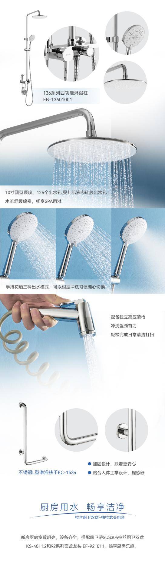 淋浴區(qū)安裝的無(wú)軌移門(mén)實(shí)現(xiàn)了地面的無(wú)障礙設(shè)計(jì),既實(shí)現(xiàn)干濕分離,又方便淋浴。精心選配136系列四功能淋浴柱EB-13601001,并貼心裝上L型淋浴扶手,帶來(lái)安全舒適淋浴體驗(yàn)。