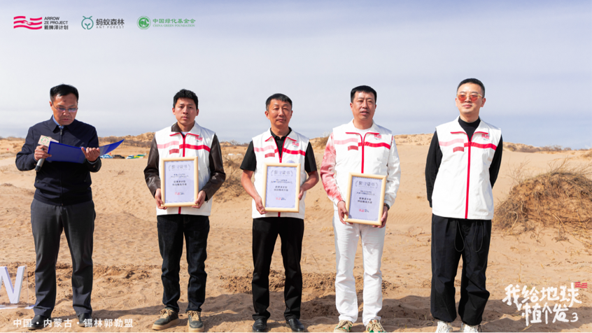 ??活動(dòng)當(dāng)天,「箭牌澤計(jì)劃」公益合伙人志愿者還在包海林老師及眾多林業(yè)專家的指導(dǎo)下,同與會(huì)領(lǐng)導(dǎo)和嘉賓一齊前往指定區(qū)域穿戴專業(yè)設(shè)備,搬運(yùn)樹苗并填土、澆水,在種植區(qū)完成了栽種計(jì)劃,成功點(diǎn)亮認(rèn)真種樹的公益信號(hào)。相信在未來,這片沙漠將會(huì)成為一道亮麗的風(fēng)景線和沙漠中的綠色屏障,推動(dòng)地球環(huán)境綠色發(fā)展。