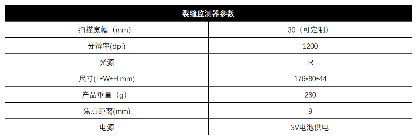 WHEC自主研發(fā)的裂縫監(jiān)測(cè)器使用3V電池供電,低功耗,能夠持續(xù)工作5年,測(cè)量精度可達(dá)到0.02mm,實(shí)時(shí)監(jiān)測(cè)裂縫寬度變化以及溫度和濕度數(shù)據(jù)。