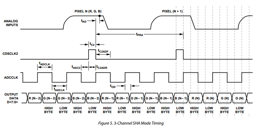 在3通道SHA模式下,AD9822同時采樣SIG1,SIG2和SIG3輸入電壓。采樣點由CDSCLK2控制。 CDSCLK2的下降沿對每個通道上的輸入波形進行采樣[A1] 。來自三個SHA的輸出電壓由DAC修改,然后由三個PGA縮放。然后PGA的輸出通過14位ADC多路復用。 ADC在ADCCLK的下降沿順序采樣PGA輸出。
